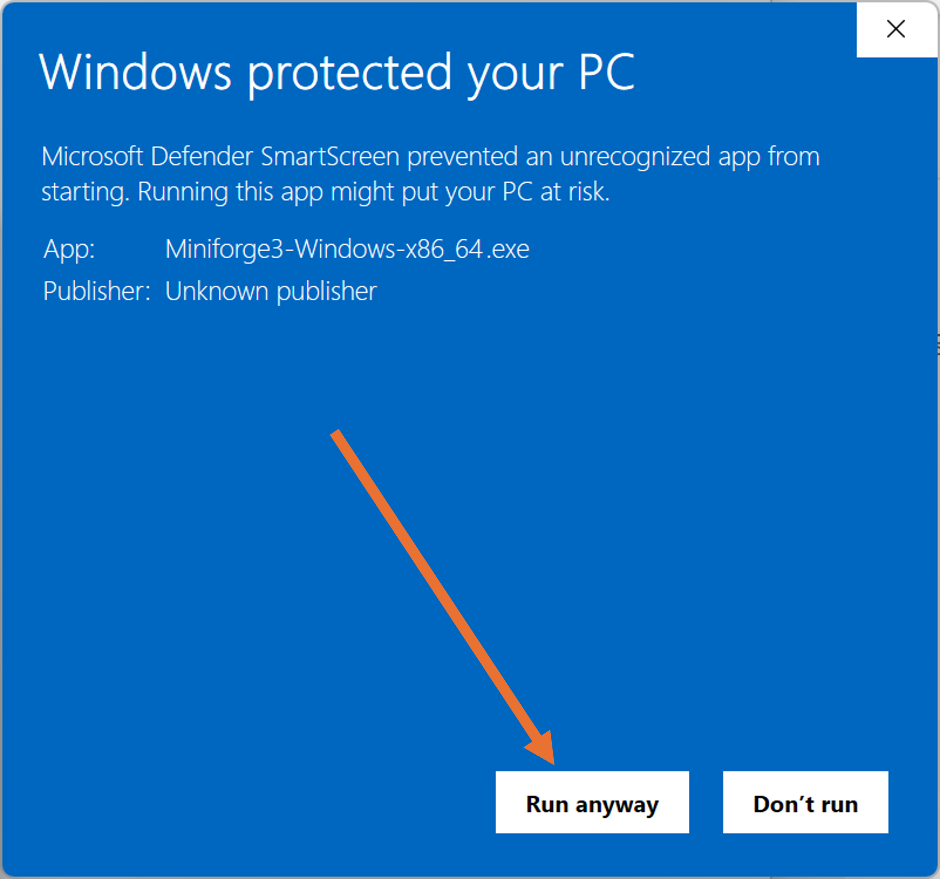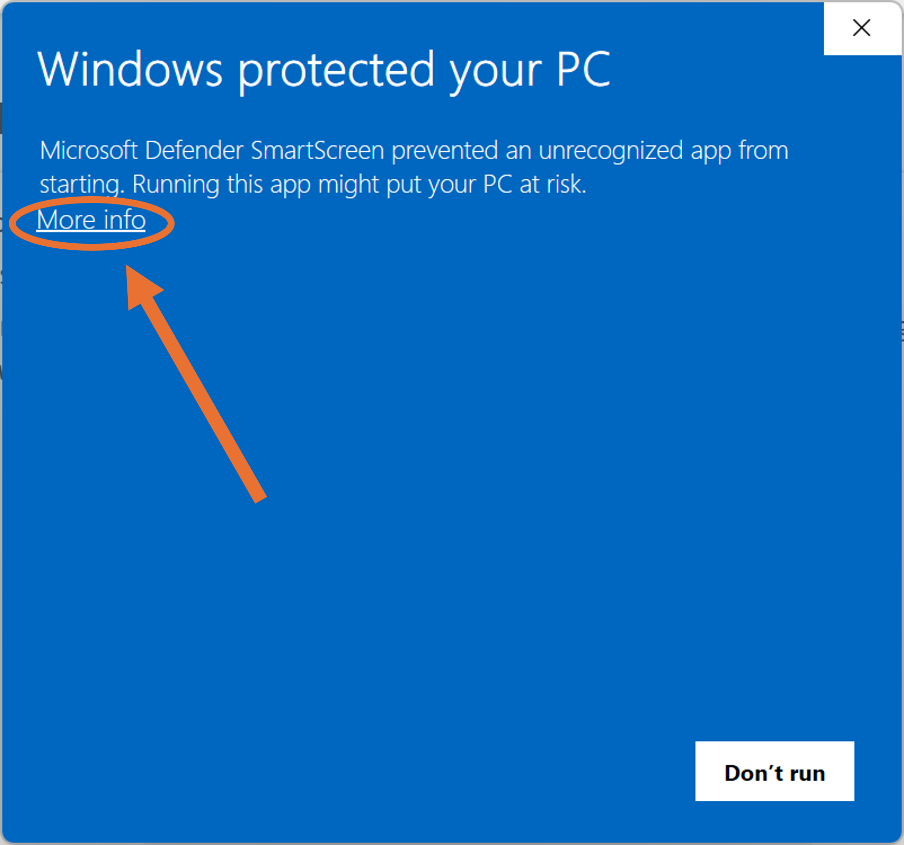 Once the installer is open you might encounter a security warning. Click on the More info button and then Run anyway.